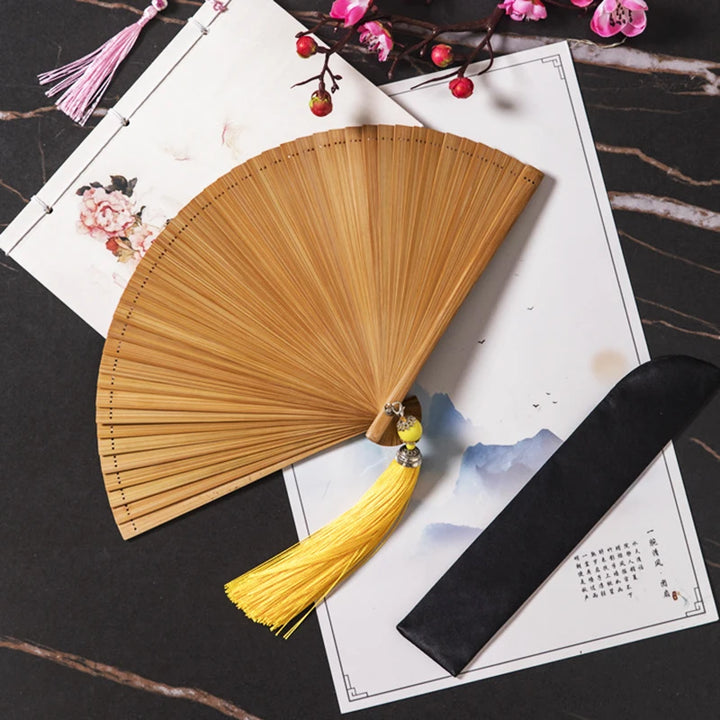 Es besteht aus geschnitztem Holz und strukturiertem, durchbrochenem Stoff und bietet einen ergonomischen Griff sowie eine ausgewogene Silhouette. Kompakt und faltbar lässt es sich im Alltag oder auf Reisen leicht transportieren.