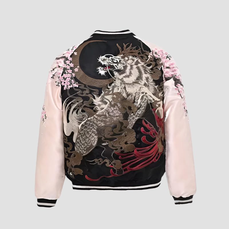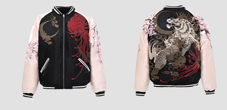 Entscheiden Sie sich mit diesem doppelseitigen Sukajan für zwei Stile in einem und kombinieren Sie Originalität, Komfort und Vielseitigkeit für einen einzigartigen Look, der sich all Ihren Wünschen anpasst.