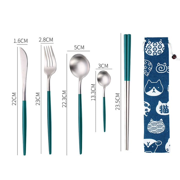 Edelstahl : Kleiner Löffel: 13,3 x 3 cm / Großer Löffel: 22,3 x 5 cm / Gabel: 23 x 2,8 cm / Messer: 22 x 1,6 cm / Essstäbchen: 23,5 cm