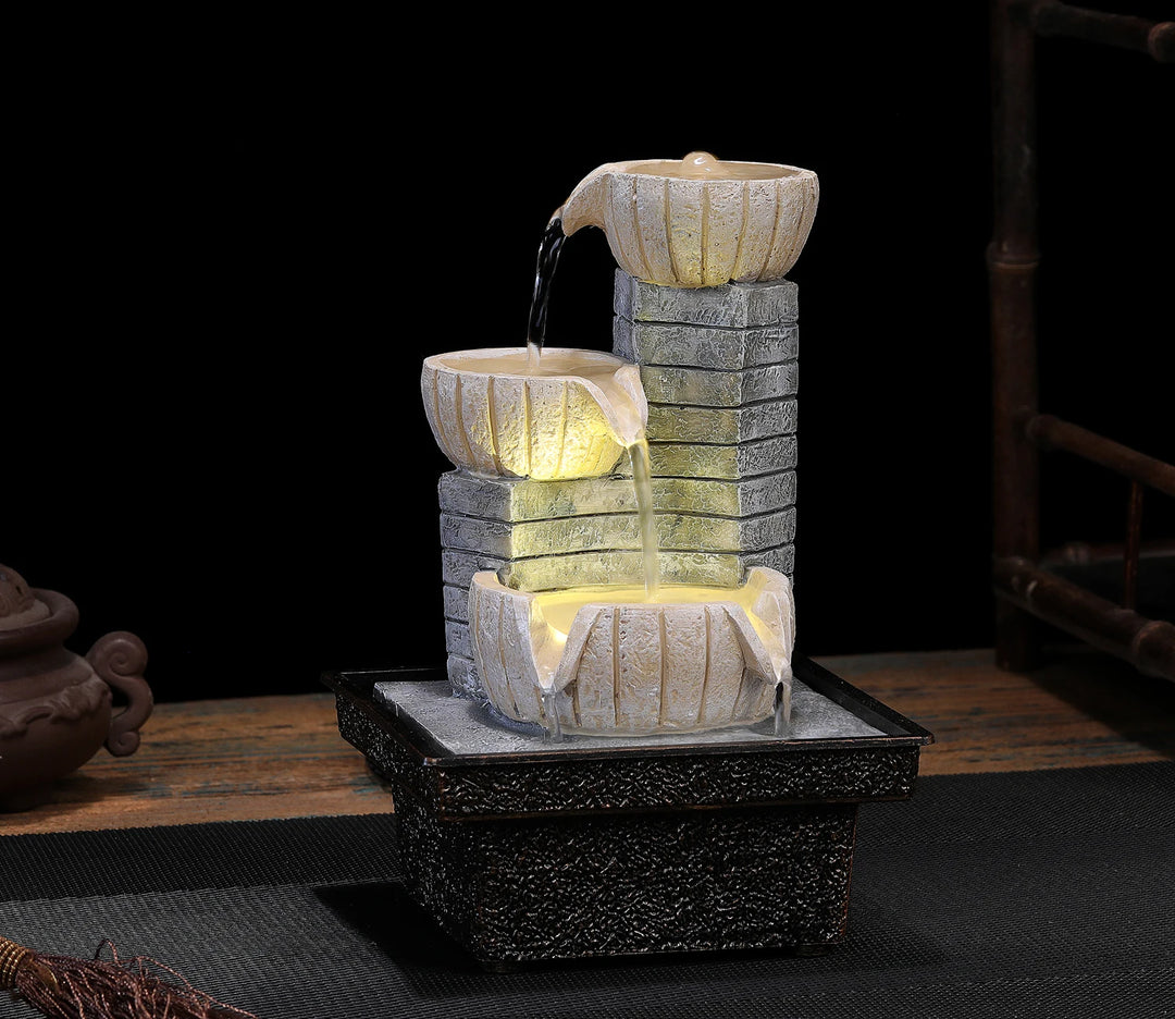 Dieser kompakte Brunnen aus geformtem Stein mit stabilem Sockel eignet sich ideal für Innenräume. Sein rotierendes Wasserspiel und die sanfte Beleuchtung schaffen eine entspannende Atmosphäre und schmücken Ihre Umgebung dezent.