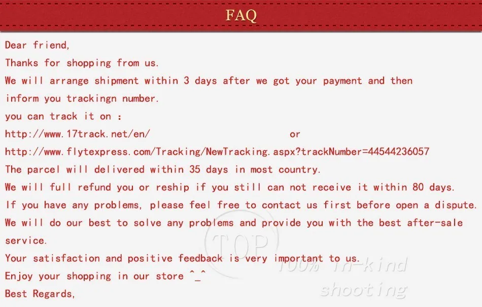 3. Please send us E-mail first before you want to leave negative feedback or dispute on Aliexpress,we are sure you will feel satisfactory with our answer.