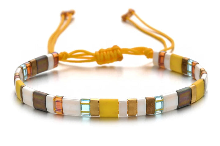 This handwoven bracelet, featuring Miyuki Tila beads and a delicate charm, creates a vibrant and sophisticated piece. The sleek design of this piece is enhanced by the charming touch of the charm, adding an extra dimension of refinement. Lightweight and adjustable, it fits perfectly on your wrist, bringing a touch of understated luxury, perfect for complementing your outfits with a subtle sparkle.