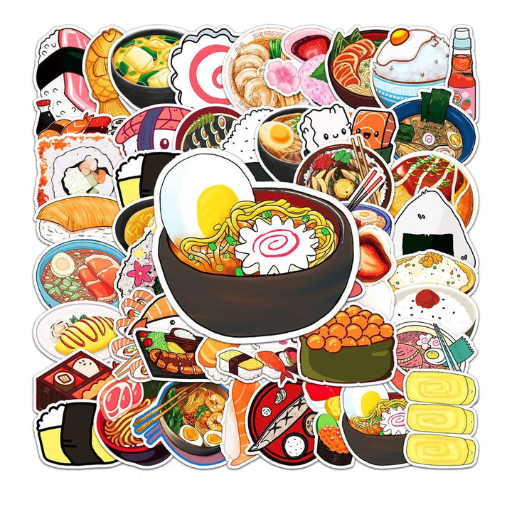 Créatif et unique : Chaque sticker est une œuvre d'art représentant des plats japonais emblématiques, du sushi au ramen, dans un style animé et coloré.